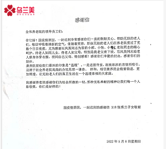 隨著錦旗一起送進來的還有一封致謝烏蘭美康養(yǎng)院全體工作人員的感謝信,來信人是在康養(yǎng)院入住的張秀蘭奶奶的子女,他們在信中感謝工作人員對張奶奶的悉心呵護、專業(yè)照顧、辛勤付出和陪伴,更稱贊康養(yǎng)院為所有的老人提供了一個幸福溫暖的大家庭,最后祝愿康養(yǎng)院的明天更加輝煌。